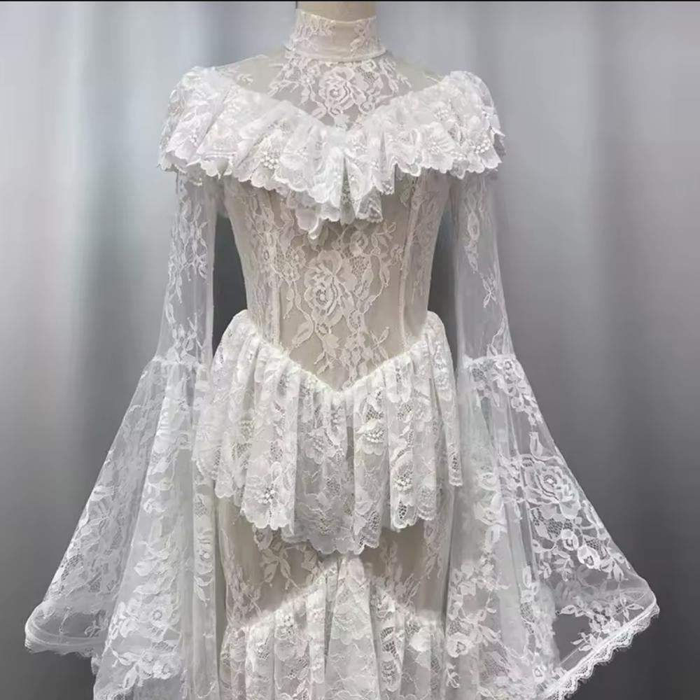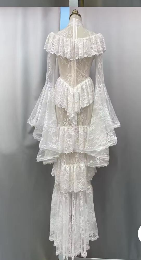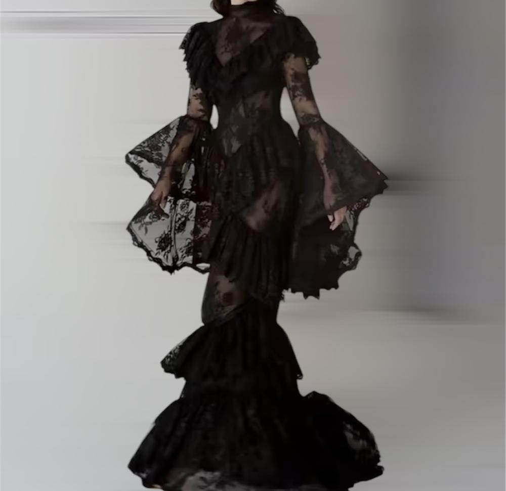 فستان دانتيل فخم مستوحى من أناقة الزمن الجميل، بتصميم جذاب وبقصّة ضيّقة تُبرز جمال القوام، مزوّد بكشكش ناعم حول الأكتاف والخصر والتنانير بطبقات متدرجة تضيف حركة وانسيابية ساحرة. الأكمام الواسعة تضيف لمسة ملكية تجعل إطلالتك فريدة في أي حفلة أو مناسبة خاصة. يتوفّر بلونين كلاسيكيين: الأسود الجذاب والرمزي، والأبيض الملكي النقي.